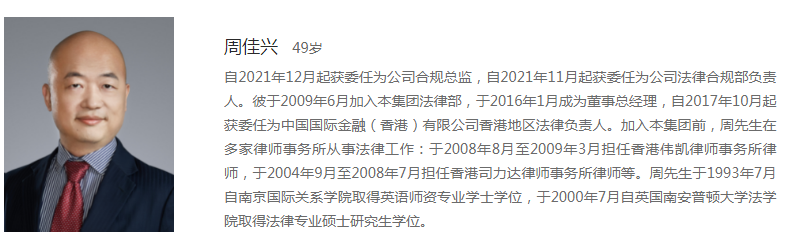 与同时拥有中美两地法律资格的前任合规总监类似,现年49岁的周佳兴,也有着海外法律背景。