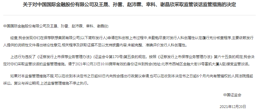 为此,证监会对中金公司及王晟、孙雷、赵沛霖、幸科、谢晶欣采取监管谈话的监管措施。要求其于2021年12月23日10:00携带有效的身份证件前往北京市西城区金融大街19号富凯大厦A座,接受证监会的监管谈话。