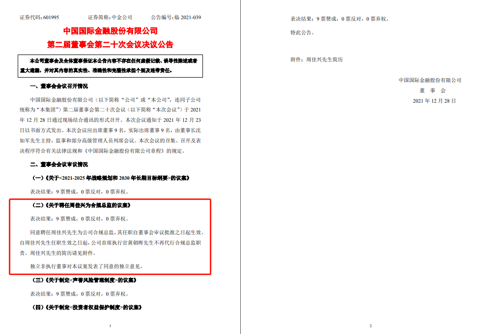经董事会审议并全票通过,中金公司聘任周佳兴先生为合规总监,即日起履职;与此同时,首席执行官黄朝晖不再代行合规总监职责。