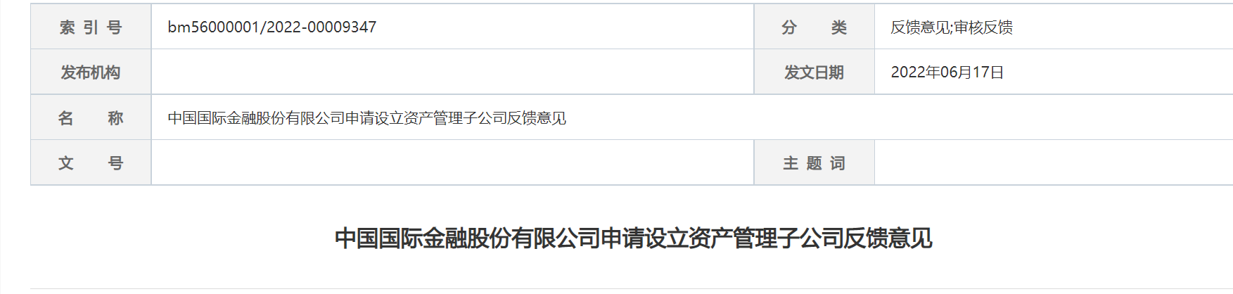 6月20日,资本邦了解到,证监会官网信息显示,6月17日,证监会对中金公司设立资管子公司做出反馈意见。这也使得中金公司成为“一参一控一牌”新规落地后首家获得监管层反馈的券商。