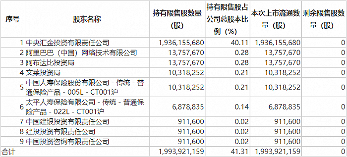 其余解禁股东还包括阿里巴巴、阿布达比投资局、文莱投资局等合计共9位股东解禁。战略配售股东的解禁收益率超过40%,原始股东持股成本更低,股东们账面浮盈超过240亿元。