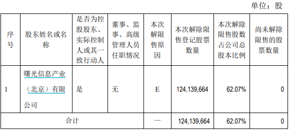 北交所公司曙光数创11月29日将有1.24亿股首发限售股解禁,占总股本比例62.07%,解禁市值55.53亿元。不过此次解禁股东只有一位,为曙光信息产业(北京)有限公司,因此解禁对股价影响有限。