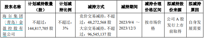 此外,海尔集团(青岛)金盈控股有限公司(下称海尔金盈)在持续减持中金公司股份。继去年套现36.85亿元后,今年5月11日至8月10日,海尔金盈又减持中金公司9,654.42万股,占总股本比例2%,套现金额35.21亿元。海尔金盈持股比例降至4.08%,近期又计划于9月4日至12月3日期间减持不超1.45亿股中金公司股份,占比不超过3%。目前减持计划期未结束,其也暂未披露减持进展。