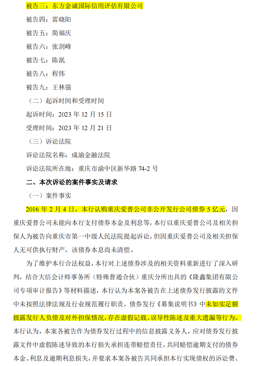 根据公告,2016年2月4日,重庆银行认购重庆爱普公司非公开发行公司债券5亿元,因重庆爱普公司未能向该行支付债券本金及利息等,早在2022年1月,该行就将重庆爱普公司告上了法庭。但因重庆爱普公司及相关担保人无可供执行财产,该债券本息至今尚未清偿。该行表示,其对上述债券涉及的相关资料重新进行了深入研判,认为本案各被告在上述债券发行披露的文件中未按照法律法规及行业规范履行职责,债券发行《募集说明书》中未如实足额披露发行人负债及对外担保情况,存在虚假记载、误导性陈述及重大遗漏等行为。因此,重庆银行认为,本案各被告作为债券发行过程中的信息披露义务人,应对债券发行披露文件中虚假陈述导致的该行损失承担连带赔偿责任。
