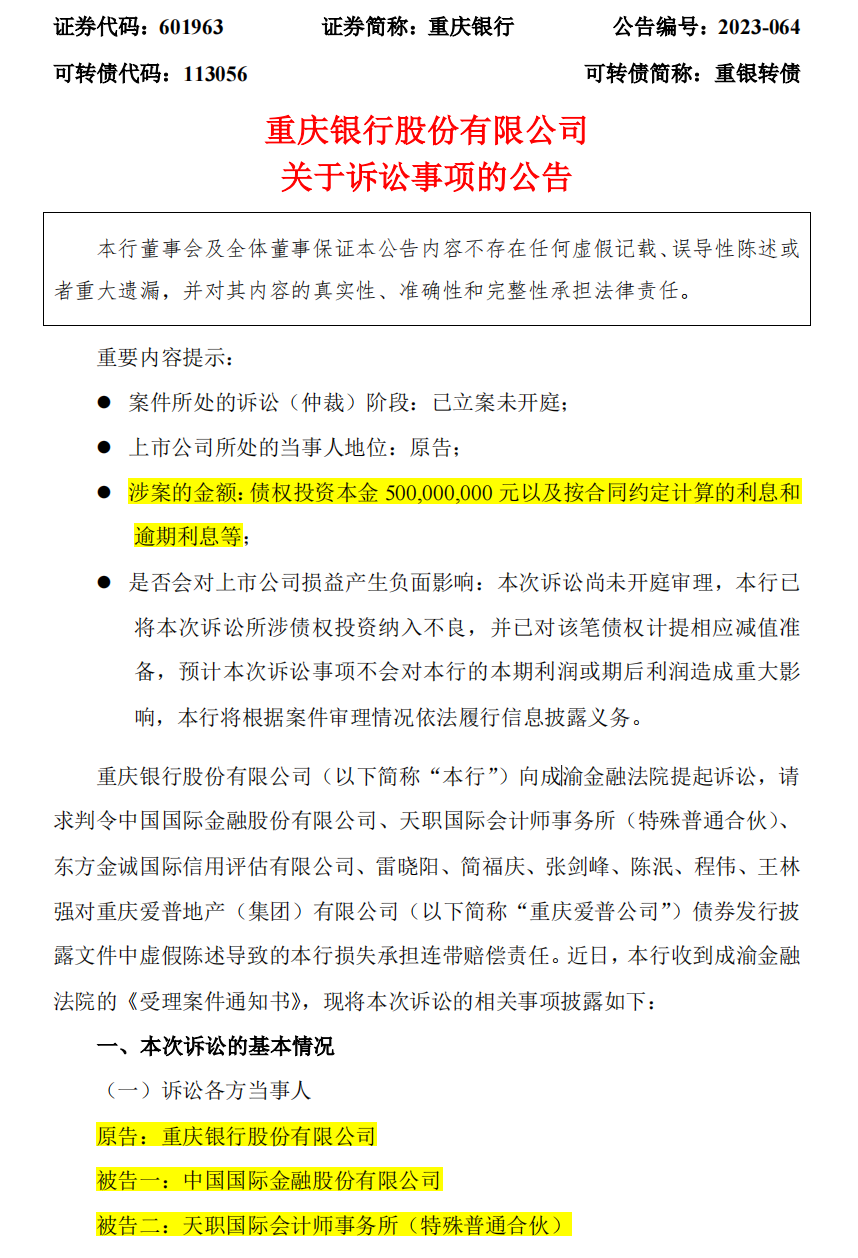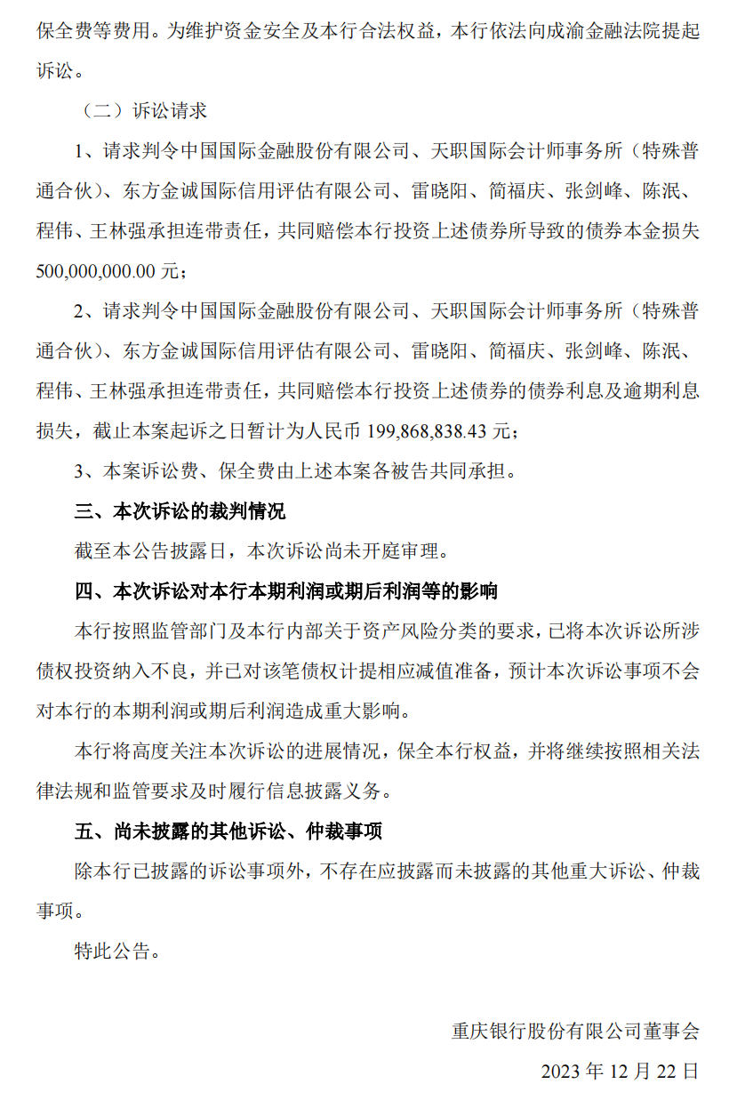 12月22日晚,重庆银行发布公告称,近日,该行收到成渝金融法院的《受理案件通知书》。此前,重庆银行将包括中国国际金融股份有限公司(下称“中金公司”)、天职国际会计师事务所(下称“天职国际”)、东方金诚国际信用评估有限公司(下称“东方金诚”)等机构以及6名自然人告上法庭,请求赔偿本金5亿元,债券利息及逾期利息损失约2亿元,粗略计算共计近7亿元。
