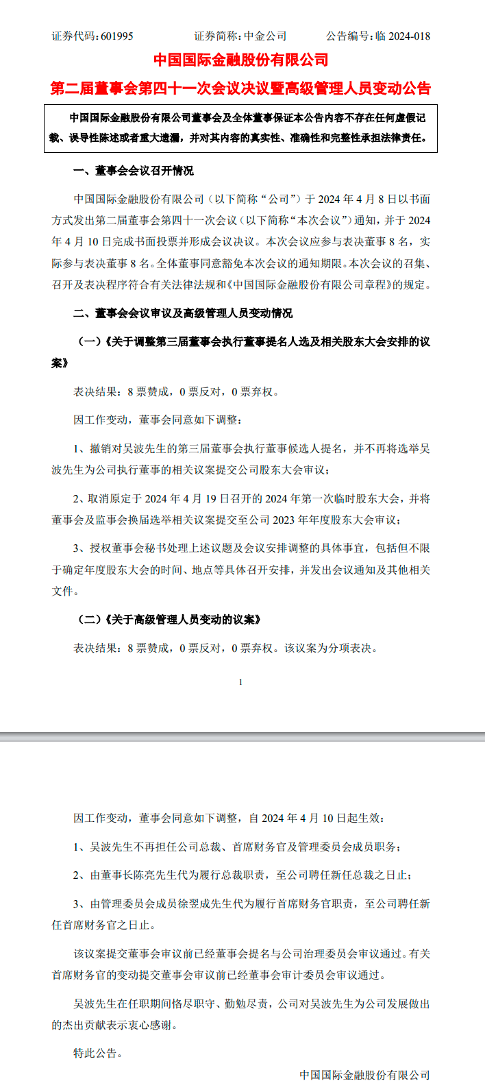 昨日,中国国际金融股份有限公司突发公告,董事会审议通过《关于高级管理人员变动的议案》。本次卸任,属于正常人事调整变动。