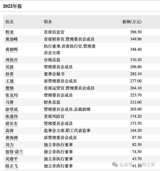 2022年,中金的高管收入有较大幅度的下滑。中金公司高管的薪酬普遍降到了200万至400万的区间,薪酬最高的首席信息官程龙为396.5万元。2023年,高管薪酬进一步下降,高管的收入回落至200万元左右,最高的黄劲峰为262.7万元。