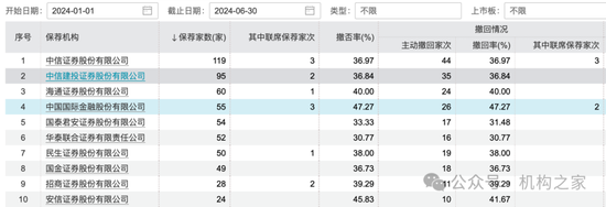 2024年,金融强监管、IPO严审核成为主基调。然而中金公司此次似乎再一次表现出了其“贵族”的迟钝。根据数据,2024年上半年,中金公司保荐55家公司,相较于2023年同期的99家,下滑约45%。更令人担忧的是,中金公司的撤否率高达47.27%,在保荐数量前十家券商中遥遥领先。这一数据不仅反映出中金公司在项目质量把控上存在问题,也暴露出其在应对监管环境变化时的适应能力不足。