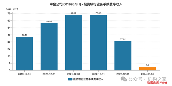 此种迟缓的恶果在2024年一季度已有所体现。2024年一季度,中金公司投行业务手续费净收入4.5亿元,同比下滑25.02%,创下近五年来最差一季度表现。