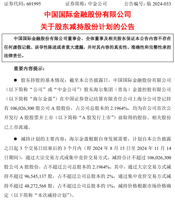 8月9日,中金公司发布公告称,股东海尔集团(青岛)金盈控股有限公司(简称“海尔金盈”)计划自公告披露之日起3个交易日结束后的3个月内,减持合计不超过1.06亿股A股股份,占公司总股本的2.1964%。