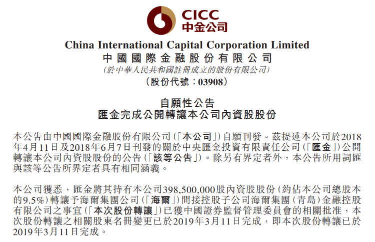 2019年3月12日,中金公司(03908.hk)发布《汇金完成公开转让本公司内资股股份》的公告。