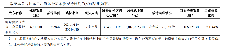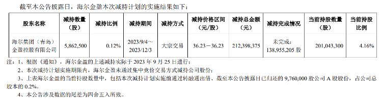 根据此前公告显示,通过之前的四轮减持,海尔金盈已回笼资金共计104.35亿元。