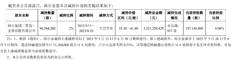 2023年5月12日至6月30日期间,海尔金盈通过大宗交易方式减持9654.42万股中金公司A股股份,占公司总股本的2%。第二轮减持价格区间为33.38元/股—41.80元/股,减持总金额为35.21亿元。
