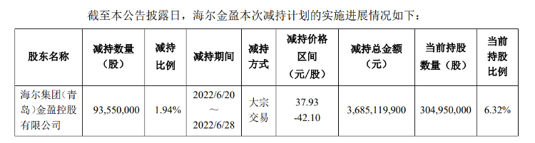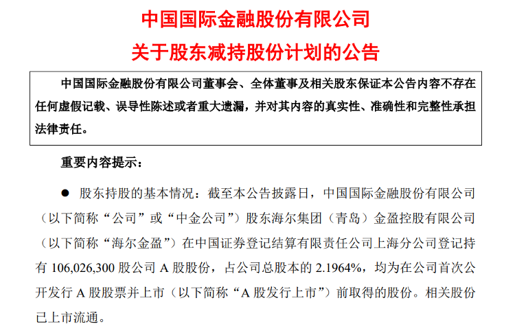 2022年6月20日至6月28日期间,海尔金盈通过大宗交易方式累计减持9355万股中金公司A股股份,占公司总股本的1.94%。本轮减持价格区间为37.93元/股—42.10元/股,减持总金额为36.85亿元。