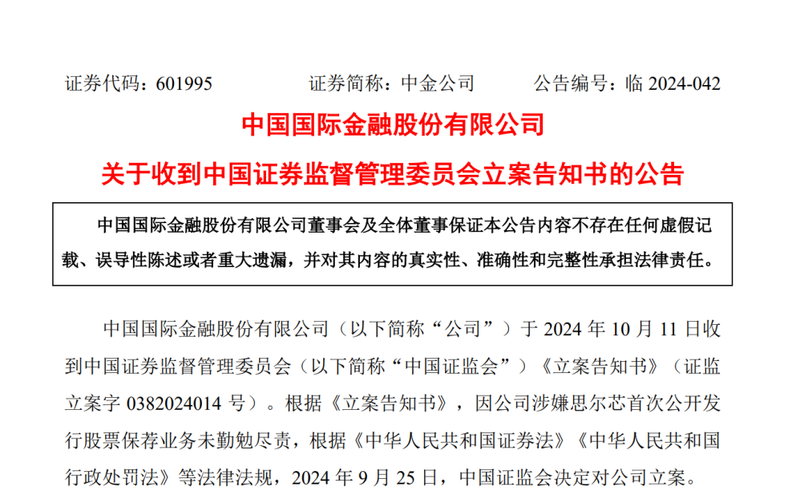 蓝鲸新闻10月11日讯(记者胡劼)受市场消息刺激,今日午后中金公司股价异动,逆市涨停收盘。然而福祸相依,当日晚间,中金公司公告称,收到证监会《立案告知书》,因涉嫌思尔芯首次公开发行股票保荐业务未勤勉尽责,根据相关法律法规,2024年9月25日,证监会决定对中金公司立案。