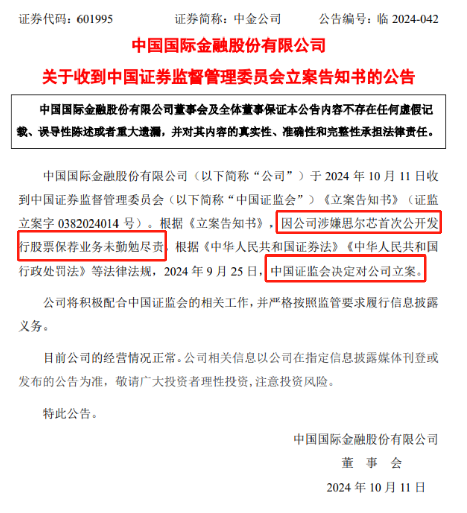 2024年10月11日晚间,中金公司发布公告称,其于10月11日收到证监会《立案告知书》。因涉嫌思尔芯IPO保荐业务未勤勉尽责,证监会决定对中金公司立案。