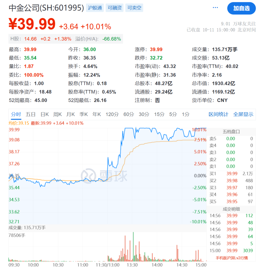 10月11日下午,中金公司股价直线冲高涨停。截至当日收盘,中金公司股价为39.99元/股,涨幅为10.01%,总市值达到1930.42亿元。自9月24日以来,中金公司股价涨幅超过39%。