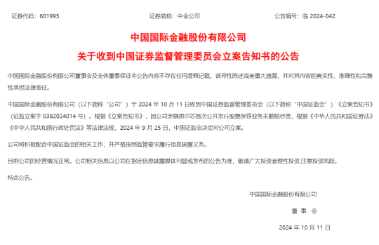 10月11日,中金公司发布公告披露,该公司于2024年10月11日收到中国证券监督管理委员会《立案告知书》(证监立案字0382024014号)。根据《立案告知书》,因公司涉嫌思尔芯首次公开发行股票保荐业务未勤勉尽责,根据《中华人民共和国证券法》《中华人民共和国行政处罚法》等法律法规,2024年9月25日,中国证监会决定对公司立案。