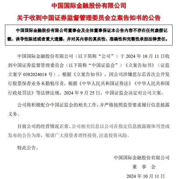10月11日,中金公司公告,该公司收到中国证监会《立案告知书》。根据《立案告知书》,因中金公司涉嫌思尔芯首次公开发行股票保荐业务未勤勉尽责,根据相关法律法规,2024年9月25日,中国证监会决定对中金公司立案。该公司将积极配合中国证监会的相关工作,并严格按照监管要求履行信息披露义务。