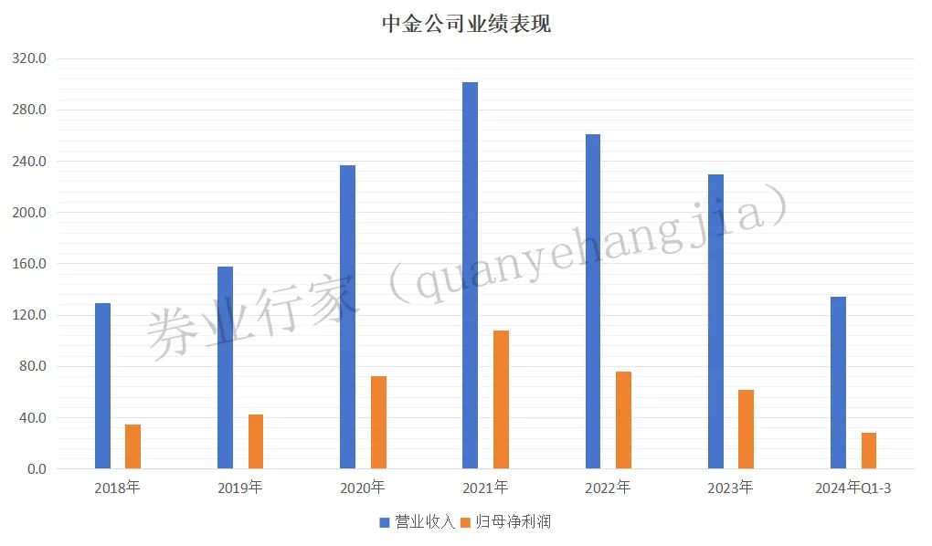 在此之前的2022年和2023年,中金公司业绩连续下跌:营业收入分别同比下降13.42%和11.87%;归母净利润分别下降29.51%和18.97%。
