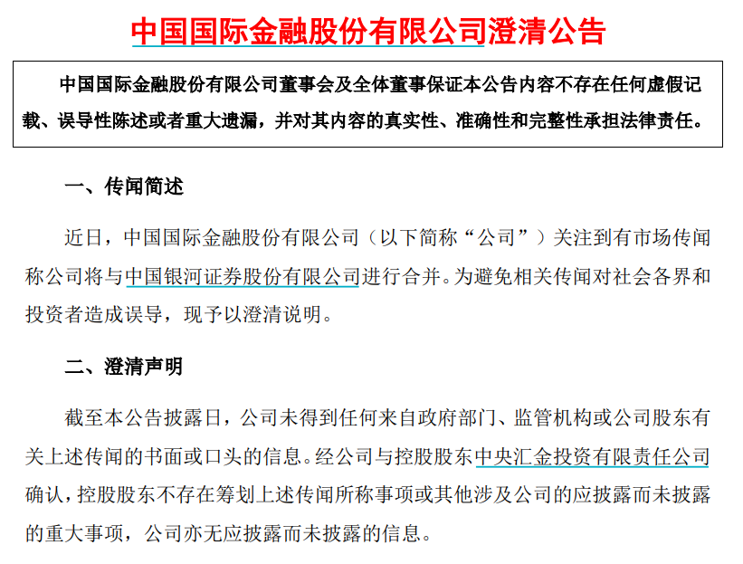 2月26日晚间,中金公司公告,关注到有市场传闻称公司将与中国银河证券股份有限公司进行合并。为避免相关传闻对社会各界和投资者造成误导,现予以澄清说明。