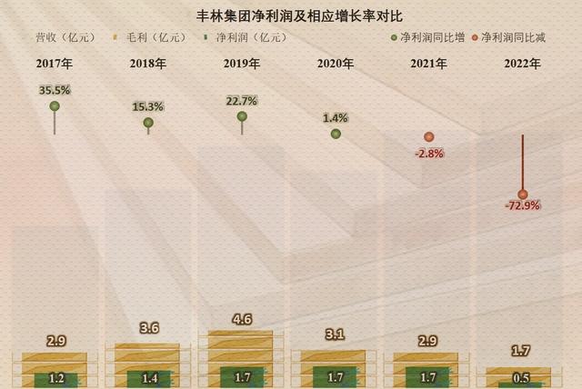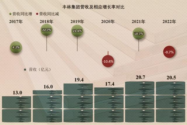 2022年,丰林集团的营收规模同比略有下降,结合着销量略有增长,也就是说人造板产品的平均价格是有所下降的。近四年来,丰林集团的营收规模变化不大,除了2020年,基本也没有太明显受到疫情的冲击。