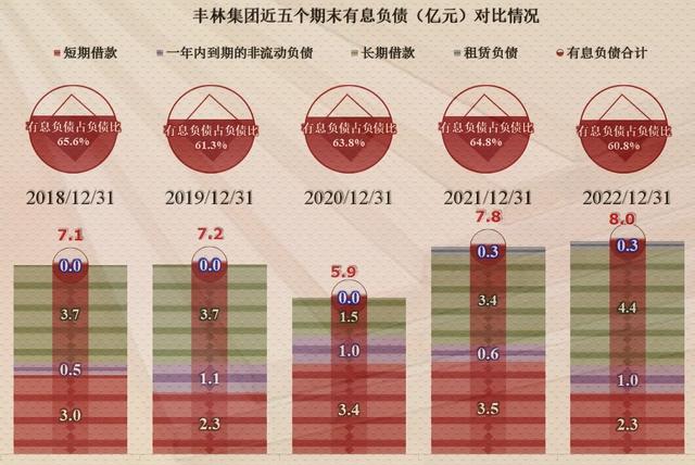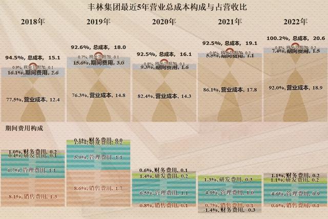 前三年还有7个多百分点的主营业务利润空间,2022年已经完全没有了。除了营业成本占营收比上升,雪上加霜的是期间费用也上升了1.9个百分点,实际上就是财务费用的占比上升了,这是什么原因呢?我们后面说其有息负债的时候再揭晓答案。