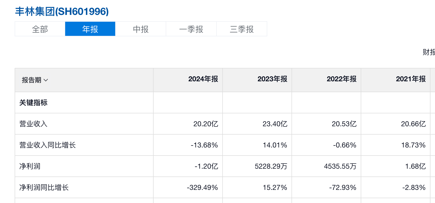 2023年,丰林集团营业收入23.4亿元,同比增长14.01%;净利润5228.29万元,同比增长15.27%。营收、净利润均实现回升。但到2024年,情况再度急转直下,这一年丰林集团营业收入20.2亿元,同比下滑13.68%;其净利润则大幅下滑329.49%至亏损1.2亿元。这也是丰林集团有业绩披露以来,首次年报净利润出现亏损。
