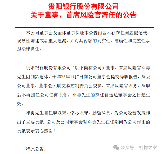1月7日,贵阳银行发布公告,邓勇因到龄退休,向公司董事会提交辞职报告,辞去公司董事、董事会关联交易控制委员会委员、首席风险官职务,辞职后不再担任公司任何职务。