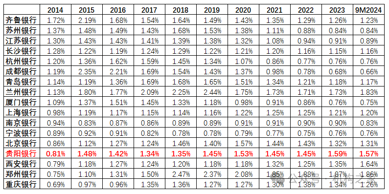 通过横向对比结合纵向分析,进一步评价该行资产质量表现。2014年,贵阳银行不良率位列上市城商行第14,处于比较低的水平。不过在2015年则跃升至同业排名第5的水平。而直到2024年三季度末,贵阳银行不良率高居1.57%,进一步上升,并在上市同业中排名第4。