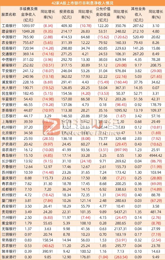 因此非利息净收入成为银行的增长点。42家银行均披露了非利息收入中手续费及佣金净收入、投资收益、公允价值变动收益以及其他业务的增长情况。