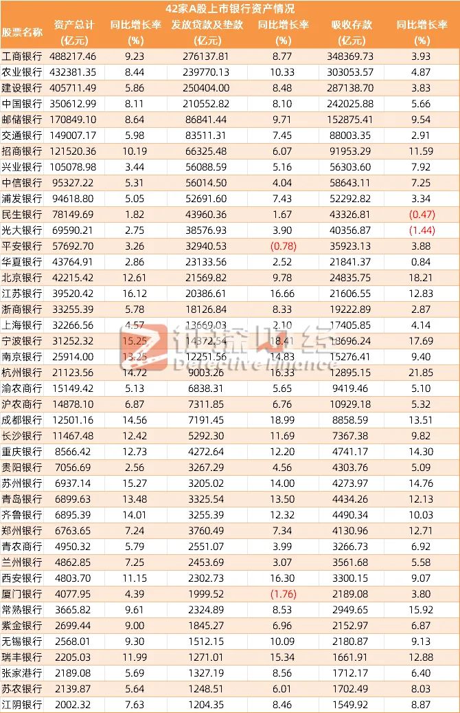 在资产规模上,42家上市银行资产规模合计302.13万亿,同比增长7.5%;其中吸收存款204.12万亿;发放贷款及垫资169.41万亿。