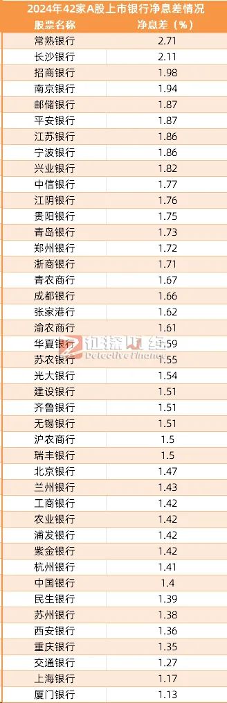 从净息差来看,42家A股上市银行,仅有常熟银行和长沙银行净息差超过2%,分别为2.71%和2.11%。有7家在1.8%-2%之间,分别为招商银行、南京银行、平安银行、邮储银行、宁波银行、江苏银行和兴业银行,其净息差分别为1.98%、1.94%、1.87%、1.87%、1.86%、1.86%和1.82%。