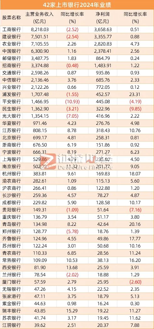2024年,42家A股上市银行总计营收56511.98亿元,同比增长0.08%;总计净利润21440.7亿元,同比增长2.35%。