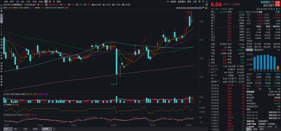 2024年底,李虹檠正式被核准就任董事会秘书一职,尽管此次拟升任副行长,估计董秘相关工作仍为其分管重点方向之一。那么,李虹檠任职期间股价表现如何呢?从大环境来看,近两年银行股正处上涨势不可挡、如火如荼的局面之中。以银行etf来看,年初至今(2025.1.2至2025.6.9)继续稳健上涨10.43%,不过同期贵阳银行仅上涨3.73%,大幅跑输。