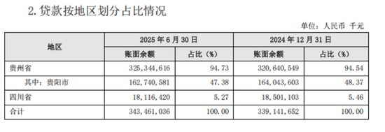 该等贷款按地区分布来看,截至2025年6月30日,贵阳银行在贵阳市的贷款1627.4亿元,较年初的1640.43亿元减少了13亿元,占比为47.38%,较年初下滑了0.99个百分点。