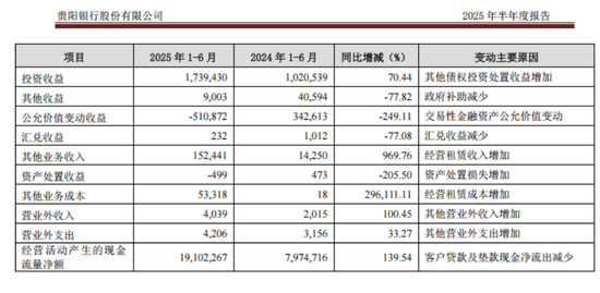 在财务报表中增减变化幅度超过30%的项目当中,贵阳银行资产处置收益为-49.9万元,同比下滑了205.5%,而其它业务成本为5331.8万元,同比增长了296111.11%,主要为经营租赁成本增加。