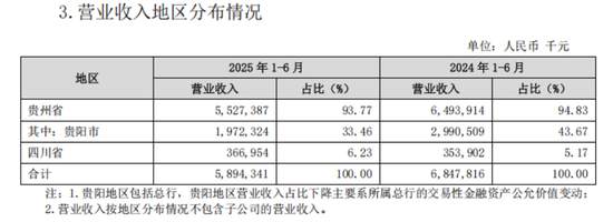 营业收入按地区分布来看,今年上半年,贵阳银行在贵阳市的收入为19.72亿元,同比下滑了34%,营收占比为33.46%,较上年同期减少了10.21个百分点。