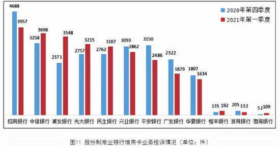 而在投诉的主要问题中,该行的信用卡业务投诉量位列股份制商业银行第二位。一季度末,该行信用卡业务投诉量3698件,环比增长13.5%,占比为87.5%。此外,一季度末,该行的个人贷款业务投诉量273件,环比增长6.6%,占比6.5%,该项业务的投诉量在股份行中位列第六。