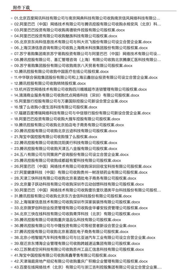 11月20日,国家市场监管总局公布了43起未依法申报违法实施经营者集中案件,其中涉及阿里、腾讯、百度、美团等互联网企业的多起股权并购案。