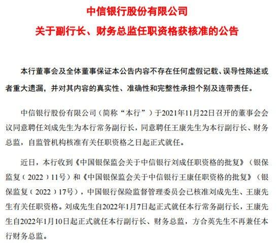 中信银行公告显示,刘成自2022年1月7日起正式就任常务副行长,王康自2022年1月10日起正式就任副行长、财务总监,行长方合英不再兼任财务总监。
