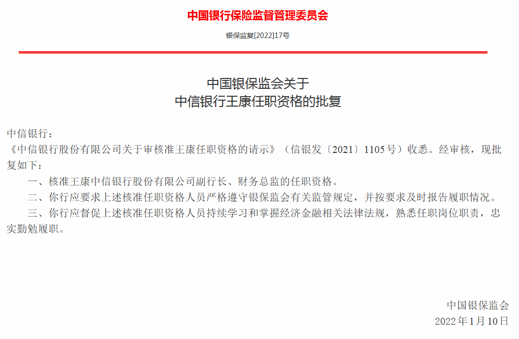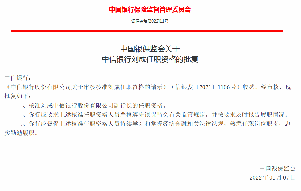 1月13日,银保监会公布两则行政批复,核准刘成中信银行副行长的任职资格以及王康中信银行副行长、财务总监的任职资格。