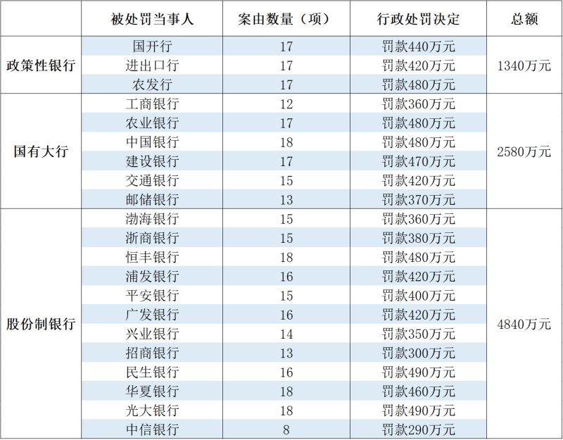 对此,银保监会官网连发21张罚单。其中,三家政策性银行共计被罚1340万元,六家国有大行共计被罚2580万元,12家股份行共计被罚4840万元。