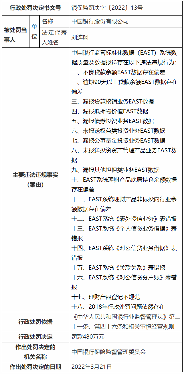 3月25日,银保监会发布公告称,于近期严肃查处一批监管标准化数据(EAST)数据质量领域违法违规案件,对政策性银行、国有大型银行、股份制银行等共21家银行机构依法作出行政处罚决定,处罚金额合计8760万元。