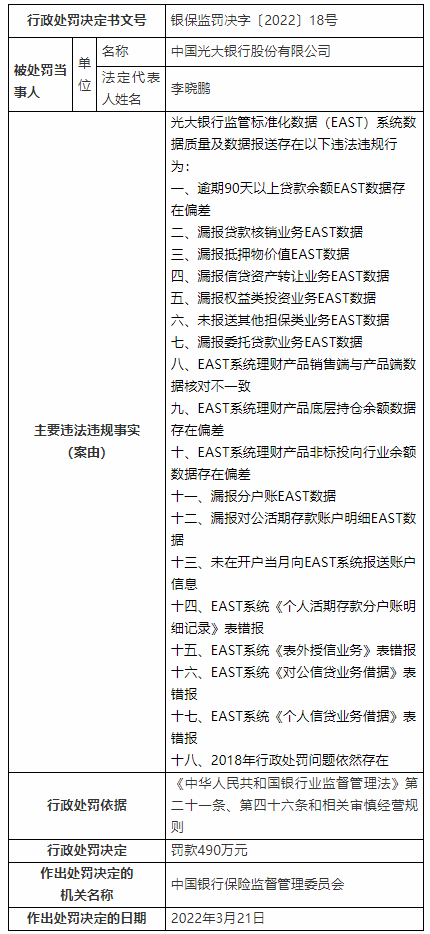 而光大银行涉及了18项案由,其中2018年行政处罚问题依然存在。
