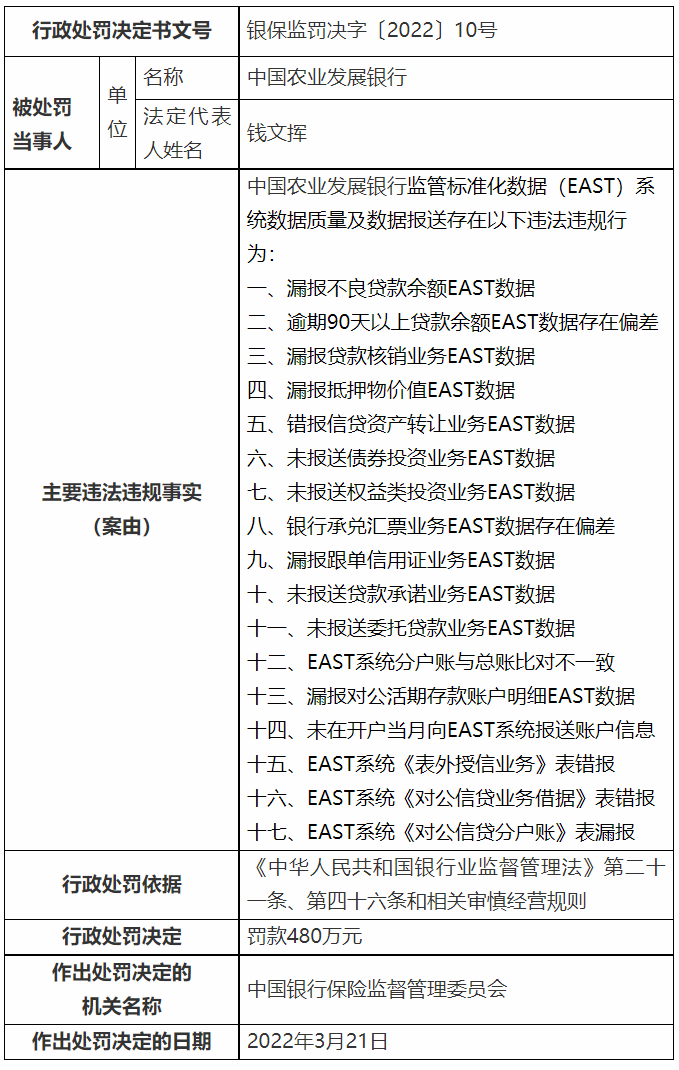 具体来看,政策性银行中,农发行收到的处罚金额最高,为480万元。罚单显示,农发行监管标准化数据(EAST)系统数据质量及数据报送存在17违法违规行为,一是漏报不良贷款余额EAST数据;二是逾期90天以上贷款余额EAST数据存在偏差;三是漏报贷款核销业务EAST数据;四是漏报抵押物价值EAST数据。