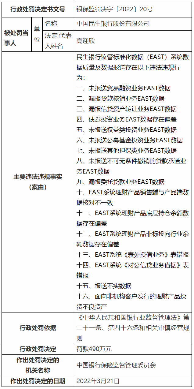 民生银行存在16项违法违规事实,包括未报送贸易融资业务EAST数据;漏报贷款核销业务EAST数据;漏报信贷资产转让业务EAST数据;债券投资业务EAST数据存在偏差;未报送权益类投资业务EAST数据;未报送公募基金投资业务EAST数据;未报送其他担保类业务EAST数据。