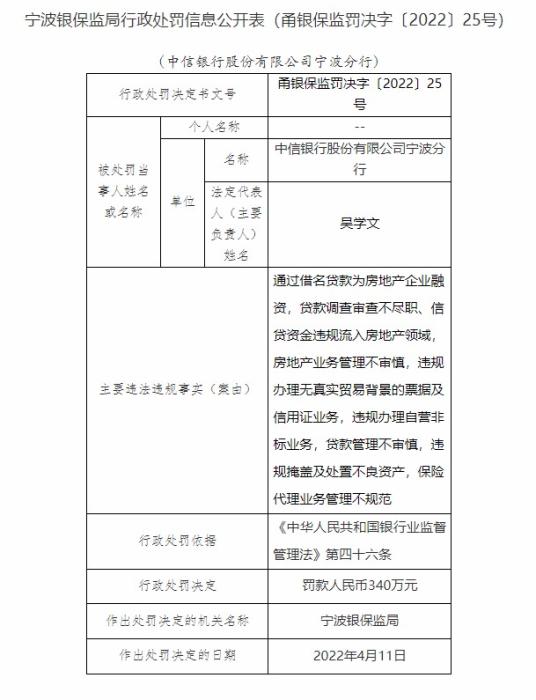 对此,宁波银保监局作出罚款人民币340万元的行政处罚决定。