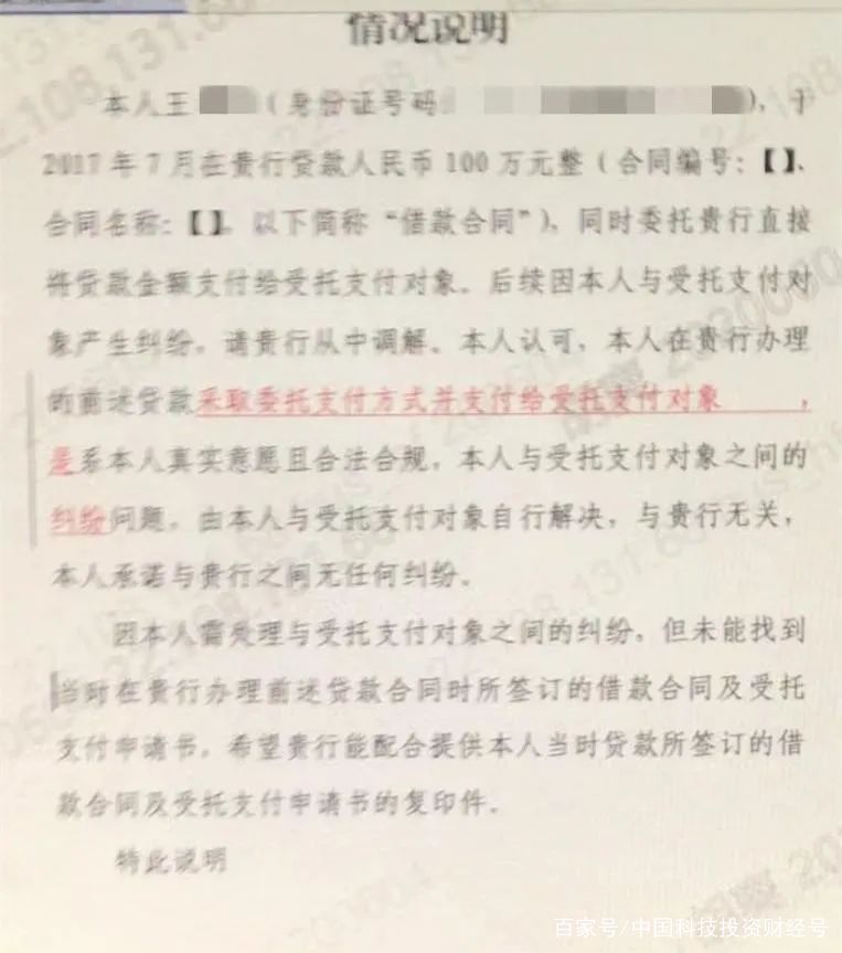 李文因上述贷款征信已逾期40多次,无法办理贷款、信用卡等。看到合同及银行流水后,李文多次与银行沟通,希望妥善处理此事。但银行仅让李文签署一份“情况说明”,该说明中提到,“本人认可,本人在贵行办理的前述贷款采取委托支付方式并支付给受托支付对象,是系本人真实意愿且合法合规……”。