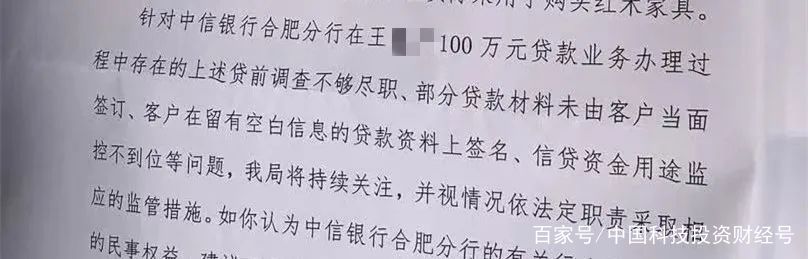 根据银保监会安徽监管局的调查,中信银行合肥分行在李文100万元贷款业务办理过程中,亦存在贷前调查不够尽职、部分贷款材料未由客户当面签订、客户在留有空白信息的贷款资料上签名、信贷资金用途管控不到位等问题。
